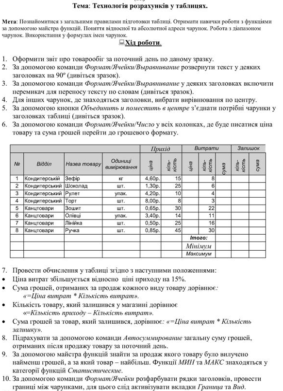 Мета: Сформувати в учнів практичні навички опрацювання табличної інформації за допомогою формул, використання в них абсолютних і відносних адрес комірок. Закріпити навички введення і форматування даних в електронних таблицях.