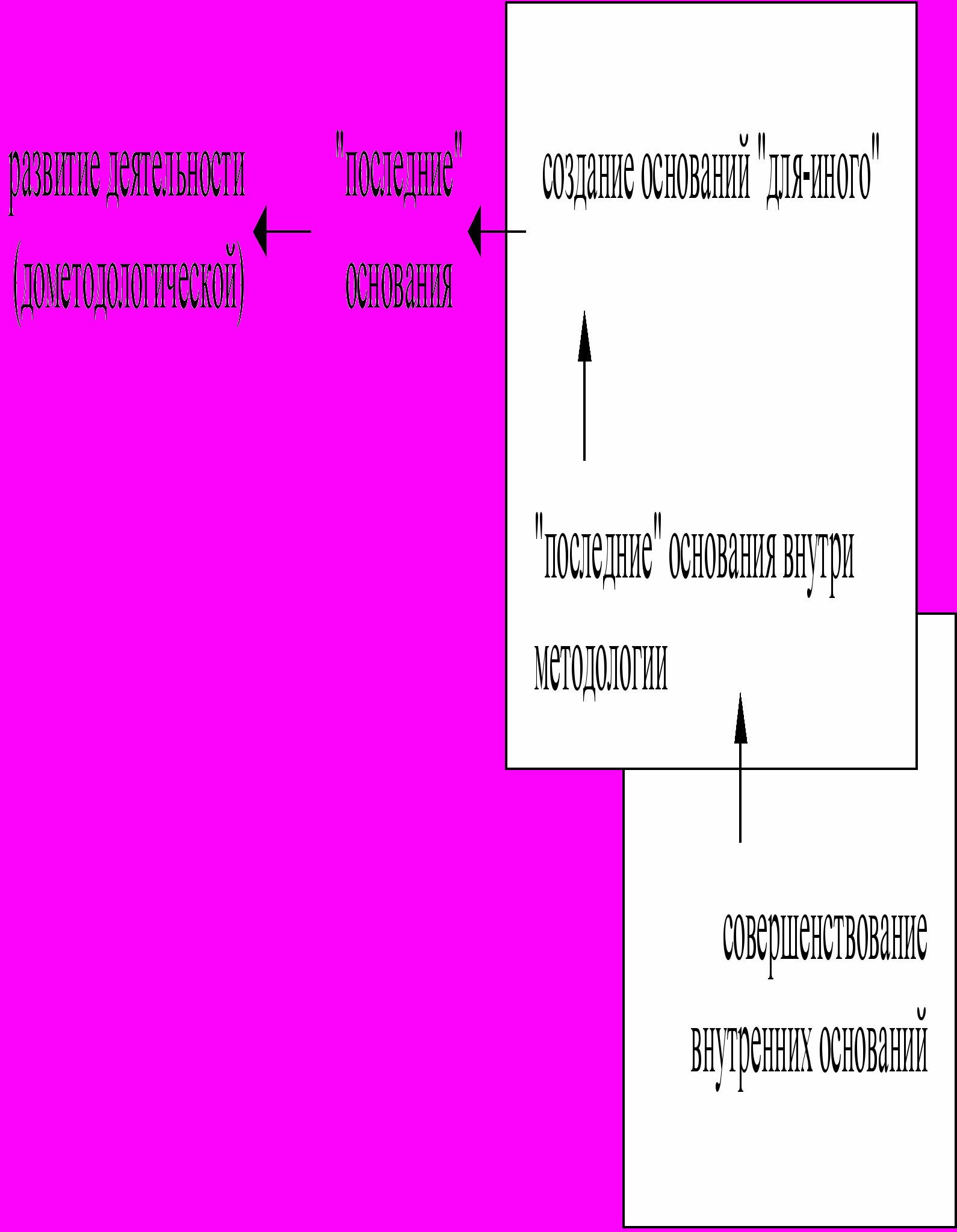 Тем самым, мы не можем согласиться с размытостью границ функции методологии, методологического типа деятельности и мышления. Если предписания, проекты средств как последних оснований организации и развития деятельности рассматриваются в качестве методологических продуктов, то это относится к бытию механизма методологической деятельности, мышления, мыследеятельности, но не к самому развитию и организации деятельности. Функция методологии в рамках кооперативной связи состоит в создании "последних оснований", также как вне кооперативной связи она состоит в укреплении "последних оснований" создания оснований (см. сх. 26):