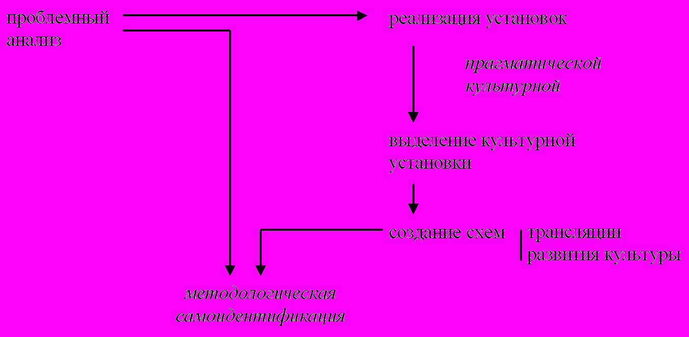 Особую роль играло сосредоточение внимания на использовании получаемых результатов теоретического, инструментально-онтологического анализа в практике методологического мышления. Именно здесь появилось осознание собственно культурного характера методологических разработок, так как прагматическое использование средств и методов не могло обеспечивать феномен трансляции культуры. Двойной характер опоры на появляющийся и накапливаемый арсенал методологии – прагматический и культурный – явился объективным условием появления схем трансляции культуры, развития культуры как средств самоидентификации участников семинара с "идеей" методологии (см. сх. 16):