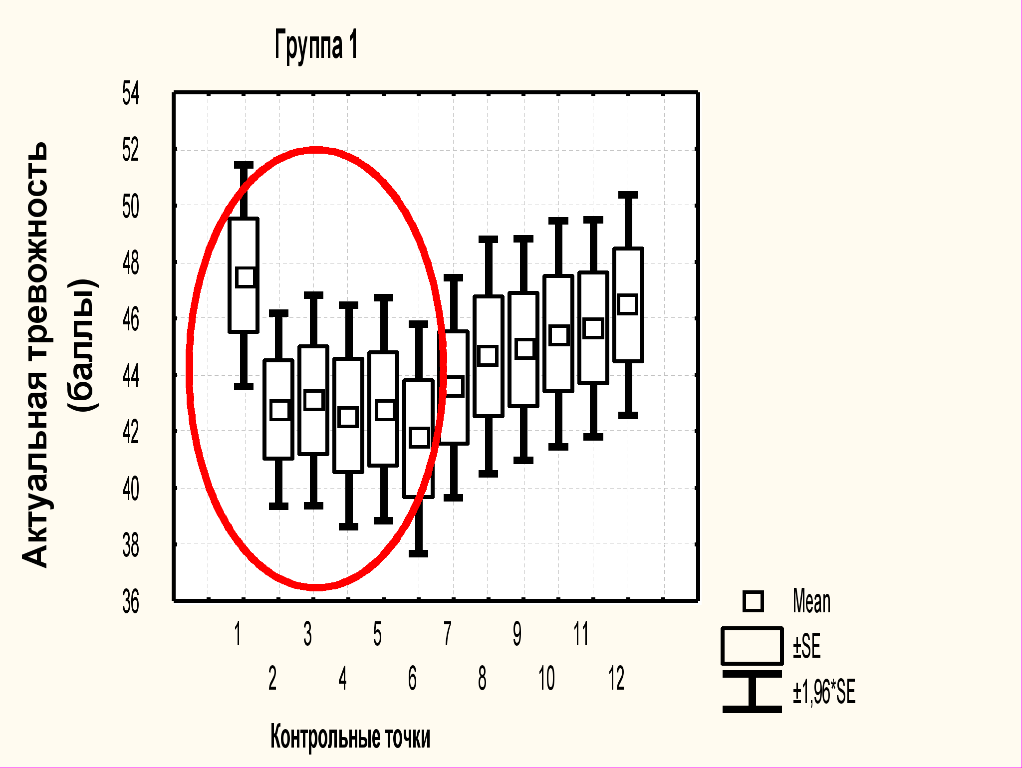 Рис. 4. Динамика показателя АТ пациентов, находившихся под наблюдением (по опроснику Спилбергера–Ханина, баллы). Эллипсами обозначены периоды вмешательства посредством КЭАП.