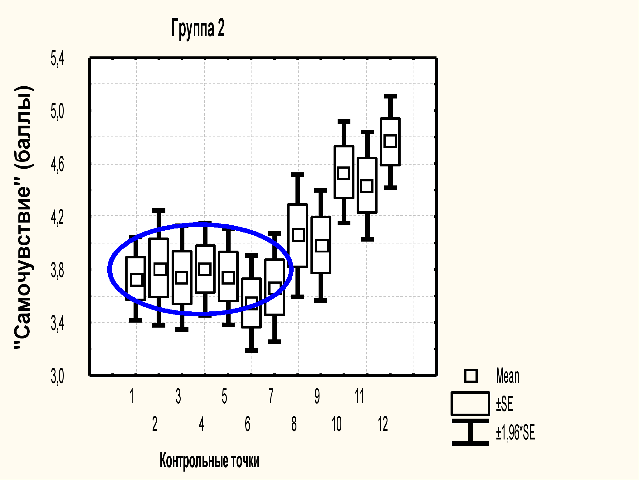 Рис. 3. Динамика показателя «Самочувствие» пациентов, находившихся под наблюдением (по опроснику САН, баллы). Эллипсами обозначены периоды наблюдения.