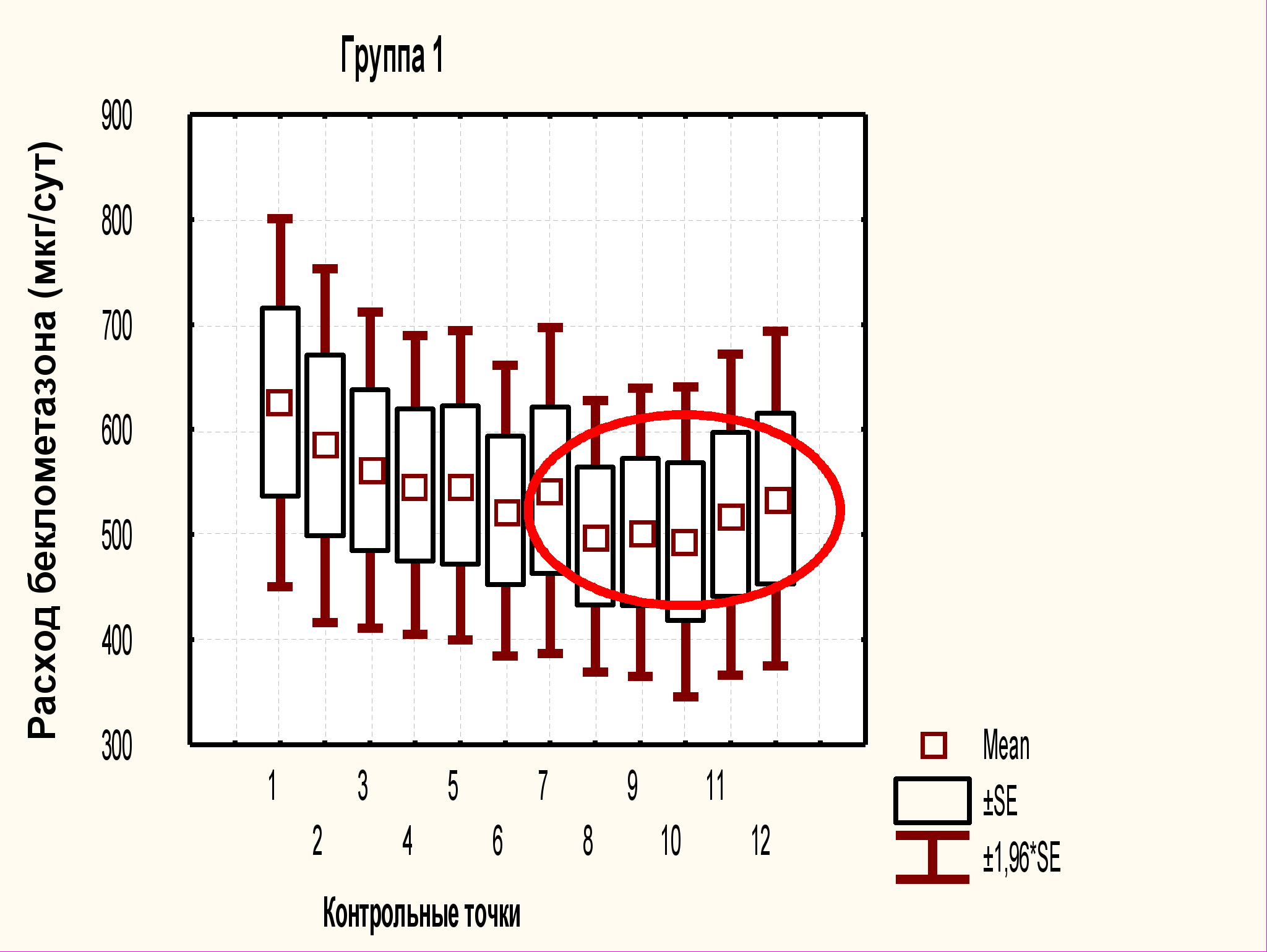 Рис. 6. Динамика расхода беклометазона пациентами, находившимися под наблюдением (мкг/сут). Эллипсами обозначен период наблюдения в группе №1 и период вмешательства посредством КЭАП в группе №2.