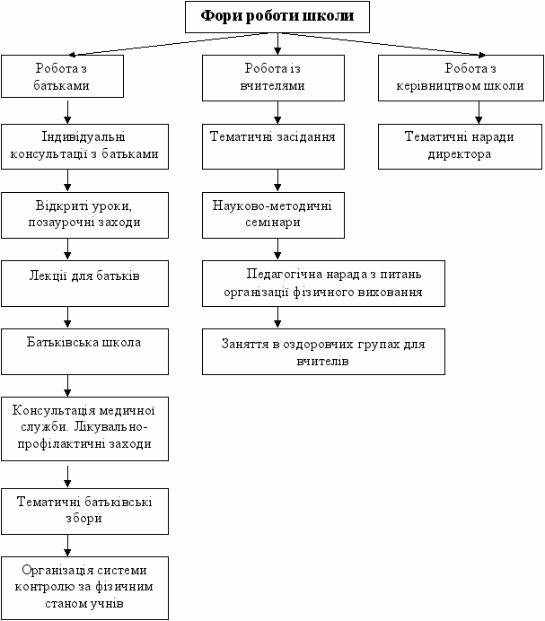 Нами розроблена система роботи сім’ї і школи, яка передбачає втілення таких форм роботи – тематичні батьківські збори, відкриті уроки та позаурочні заходи, індивідуальні консультації, лекторії для батьків, система контролю за фізичним станом учнів, консультації медичної служби, лікувально-профілактичні заходи.