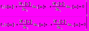 Получаем линейную систему уравнений. Если J(x[0]) не вырождена, то эта система имеет единственное решение x[1]. Линейную систему удобно решать относительно поправки Dx[0]=x-x[0], а затем вычислять очередное приближение x[1]=x[0]+Dx[0]. В общем случае: x[m+1]=x[m]+Dx[m], где Dx[m] решения линейной системы f(x[m])+J(x[m])Dx[0]=0 или в координатной форме: