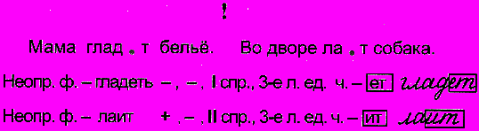 Следующее задание предписывает «закрыть», где возможно, окошки в окончаниях глаголов: клад.м, (ты) свар…, теч.т, (вы) готов.т. и т.п. и определить их спряжение. Это поможет детям осознать, что спряжение они умеют определять только по ударным окончаниям. Как определить спряжение глагола, если окончание безударное? Пока ребятам не известно. А выяснить это важно, так как именно спряжение подсказывает, какое окончание выбрать: с е или и, -ут (-ют) или –ат (-ят). Такой вывод можно считать постановкой новой учебной задачи.