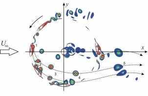 У роботі для ілюстрації особливостей обтікання ротора Дар’є були обрані геометричні параметри та коефіцієнт швидкохідності, що відповідають експериментальній роботі G. Brochier (рис. 9). На рис. 8 б окрім стандартної візуалізації вихорів додано суцільні та пунктирні лінії, а також окремі точки для того, щоб стиль інтерпретації розрахункових даних відповідав стилю візуалізації експериментальних даних роботи G. Brochier. Наведено реконструкцію структури течії при роботі дво- і трилопатевого роторів Дар’є на основі натурного (а) та обчислювального (б) експерименту (рис. 10). Для наочності залишені вихори максимальної інтенсивності. Виділено стадії зародження, розвитку та зриву вихорів за різних положень лопаті на траєкторії.