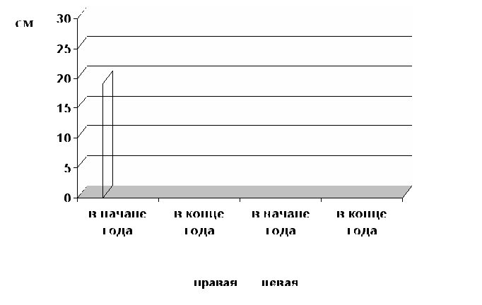 Как видно из рисунков 8-11, в экспериментальной группе в конце года наблюдался значительный прирост показателей «неведущей» стороны по сравнению с контрольной, что доказывает эффективность использования симметричной подготовки на занятиях комплексной хореографической подготовкой с акробатами на этапе начальной спортивной специализации.