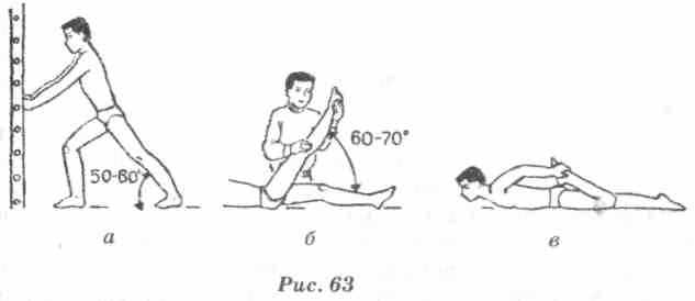 кой ягодицы (рис. 63, в). При этом бедро сгибаемой ноги не должно отрываться от поверхности пола. В норме пятка должна касаться ягодицы (при разогнутом тазобедренном суставе). При недостаточной гибкости подвздошно-поясничной мышцы возникает непроизвольное компенсаторное сгибание ноги в тазобедренном суставе. При недостаточной гибкости прямой мышцы бедра испытуемый непроизвольно прогибается в спине. Изменения гибкости тестируемой группы мышц в процессе тренировок можно определять по уменьшению или увеличению расстояния от колена согнутой ноги до пола.