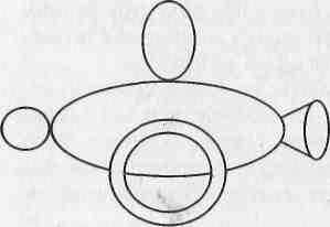 Центральным звеном разработанной методики констатирующего обследования детей стала объемная пластилиновая модель, в исходном положении состоящая из пяти элементов: двух сглаженных цилиндров (большого и маленького), фигур в виде шара, конуса и кольца. Четыре элемента модели имеют одинаковый цвет, один элемент (шар) отличается от остальных. Все детали соединены в одну фигуру абстрактной формы, условно названную Окс. Ее конфигурация не сходна с каким-либо предметом (рис. 3).