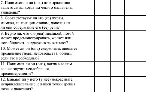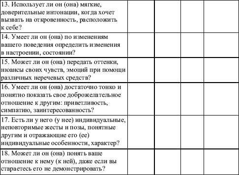 Наблюдение за одним человеком. Составьте таблицу для регистрации результатов наблюдения, состоящую из двух строк и двенадцати столбцов (см. таблицу). Каждый столбец — показатель по схеме Бейлза. В одной строке фиксируйте вербальные проявления, в другой — невербальные. Вы сможете понять, какими поведенческими средствами владеет человек и в какой сфере преимущественно располагаются его реакции. Если вы наблюдаете за человеком, имеющим определенные проблемы в общении, у вас появится интересный материал для консультации.