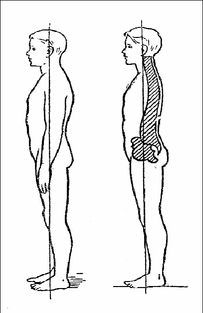 Часто прямое положение позвоночника и выпяченная вперед грудная клетка дают обманчивое представление о хорошей осанке. Смещенная вперед грудная клетка как бы оттягивает лопатки вперед, их внутренние края и нижние углы расходятся и отстают от ребер: лопатки приобретают крыловидную форму. Уменьшение изгибов позвоночника снижает его амортизирующие свойства особенно при беге и прыжках. У человека с плоской спиной под действием различных деформаций легко может возникнуть боковое искривление (сколиоз), а также нередко бывают боли в поясничной области.