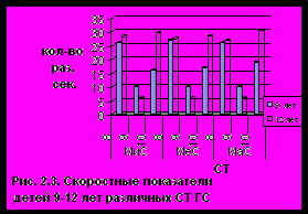 в 9 лет в скоростных показателях дети ОГ МаС типа немного превосходят детей МиС и МеС типа; в 12 лет в скоростных показателях дети ОГ всех СТ показали одинаковый результат (Рис. 1.3.);
