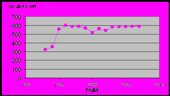 Учитывая же, что средняя доза плазмадачи по сравнению с 1992г. возросла практически в два раза – с 300,0 мл до 600,0 (рис. 7) – становится понятным, что заготовка плазмы в Санкт-Петербурге достигла сравниваемого уровня 1992г.