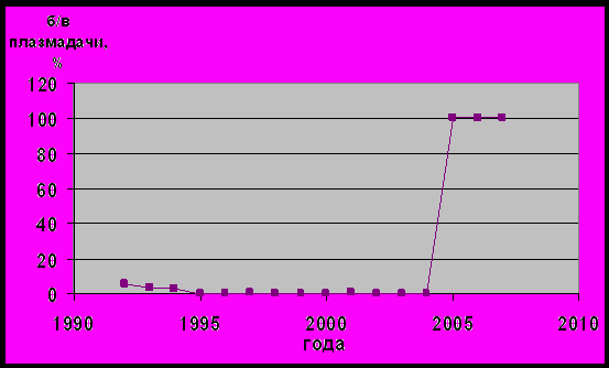 Рис. 5. Относительное содержание доноров плазмы среди доноров крови С-Пб (1992-2007г.г.)