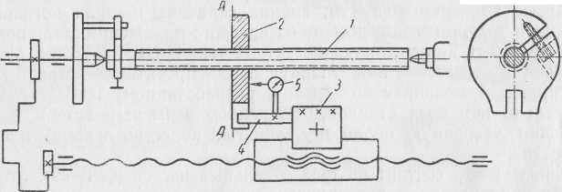 В резцедержатель 3 зажимается специальная державка 4, свободный конец которой входит в паз гайки и удерживает ее от вращения. На державке укреплен индикатор 5, мерительный штифт которого касается шлифованного торца гайки. Станок настраивают на нарезание резьбы с шагом, равным шагу эталонного винта.