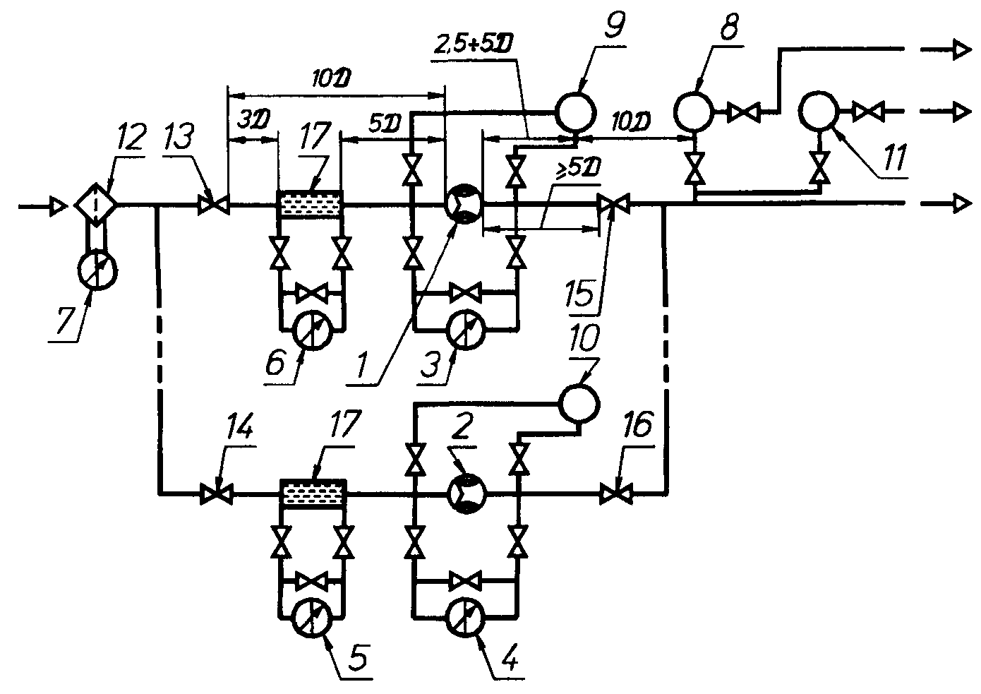— прямые участки измерительного трубопровода, расположенные до турбинного счетчика, между счетчиком и гидравлическими сопротивлениями;
