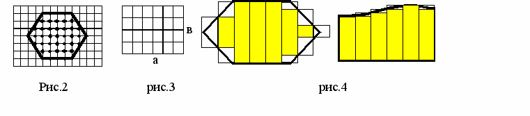 (рис.3).Чтобы показать, что единицами измерения площади могут служить другие фигуры, можно предложить фрагменты различных правильных паркетов и измерить их площади в треугольниках, шестиугольниках и т.д. После чего может быть введен другой способ измерения площади фигуры с помощью разбиения на прямоугольники (рис.4). В этом случае вычисляется площадь прямоугольников, лежащих внутри фигуры - n, а также площадь прямоугольников, внутри которых лежит данная фигура - m, после чего оставляется неравенство вида: n