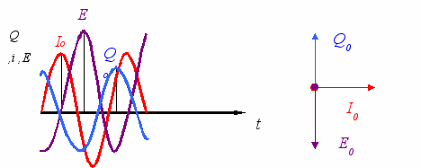 Для раскрытия физической сущности электромагнитных колебаний используется метод векторных диаграмм. Построение ведется по четвертям периода и сопровождается объяснением того, как изменяется каждая из величин, представленных на диаграмме. Фазовые соотношения определяются исходя из того, что сила тока имеет смысл скорости изменения заряда, а э.д.с. самоиндукции (с учетом знака) – скорости изменения тока. При изучении механических колебаний было установлено, что Рис.1