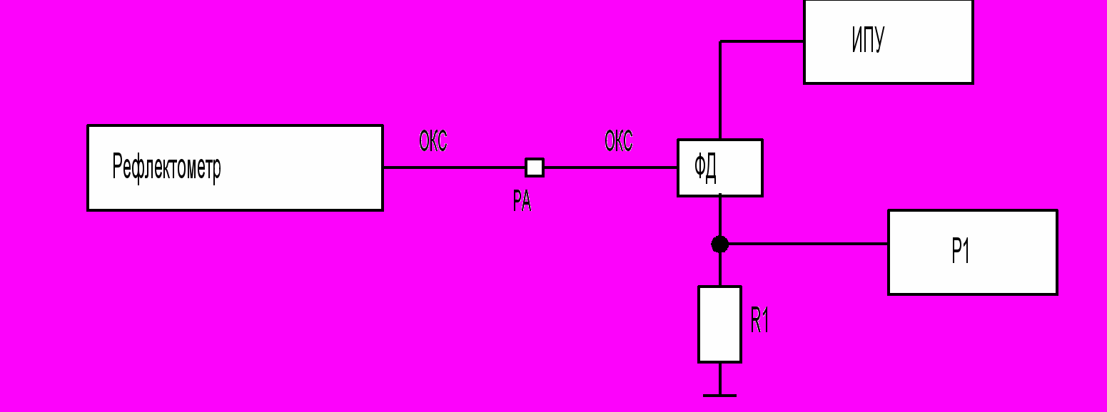 ОКС— оптический кабель соединительный; РА— регулируемая оптическая розетка-аттенюатор, ФД— pin-фотодиод; R1— резистор с сопротивлением 50 Ом 10 %; ИПУ— источник питания универсальный; Р1— осциллограф С1-75.