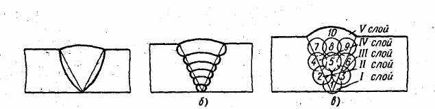 Рисунок 7. Схема многослойной сварки: а) последовательное наложение; б) "каскадное" наложение; в) метод "горки".