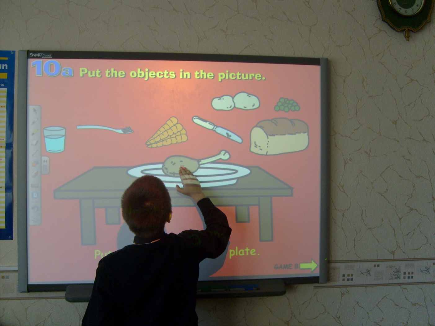 Использование интерактивной доски. Она предоставляет учителю новые возможности работы на уроке. Всё, что есть на компьютере, демонстрируется и на интерактивной доске. На ней можно передвигать объекты и надписи, добавлять комментарии к текстам и рисункам, сохраняя их для последующего использования, выделять ключевые области и добавлять цвета. Тексты, рисунки или подсказки к заданиям можно скрыть, а затем показать в ключевые моменты урока. Преподаватели и учащиеся делают всё это у доски перед всем классом, что привлекает всеобщее внимание. Работа с интерактивной доской позволяет учителю активизировать деятельность учащихся на уроке, объяснить новый материал, проверить знания учащихся, вовлечь их в дискуссию.