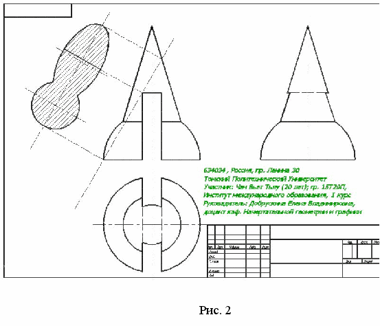 Задание конкурса 2003 г. состояло в следующем. Необходимо было начертить три вида детали (вид спереди, вид слева и вид сверху) и наклонное сечение без нанесения размеров. Деталь состояла из полусферы и конуса со сквозным прямоугольным вырезом, как показано на рисунке 1. Следовало также разработать компьютерную геометрическую трехмерную модель этой детали, сформировать рациональную сцену для отображения всех элементов детали и выполнить визулизацию разработанной сцены.