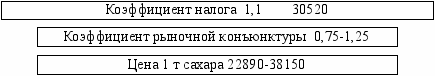 Колебания конъюнктуры с учетом воздействия указанных выше факторов в целом по российским регионам находятся в пределах от 0,75 до 1,25. Вследствие этого, цена 1 т сахара-песка по регионам России в 2009 г. находилась в пределах от 22890 до 38150 руб.