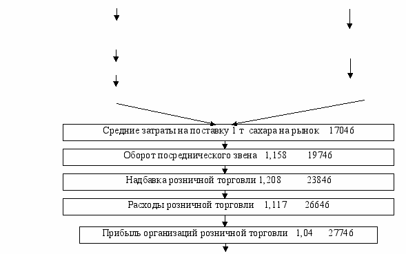 В процессе дальнейшей розничной реализации при доведении сахара-песка до потребителей цена сахара увеличивается: при этом средняя величина затрат по доставке 1 т сахара-песка умножается на коэффициенты удорожания за счет оборота посреднического звена – 1,158, за счет надбавок розничной торговли – 1,208, за счет расходов организаций, осуществляющих розничную реализацию сахара-песка – 1,117, за счет прибыли организаций розничной торговли – 1,04, за счет НДС -1,1. В конечном итоге потребительская цена 1 т сахара-песка складывается на уровне 30520 руб.