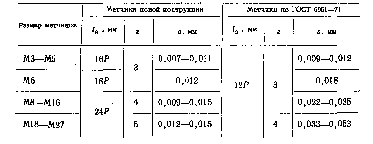 Отличительные основные конструктивные особенности метчиков новой конструкции от конструктивных особенностей метчиков по ГОСТ 6951—71 следующие: заборная часть удлинена (для метчиков М8—М27 до 24Р); количество канавок увеличено до 4—6 (метчики М8—М27); ширина пера FП=0,2÷0,25d (d—номинальный диаметр резьбы, мм) при диаметре сердцевины dс≥0,5d; рабочая часть напайная (метчики М6 и больших размеров), что создает определенные технологические и эксплуатационные преимущества (табл. 1 и рис, 1). Длина калибрующей части метчиков lк=8Р (соответствует ГОСТ 6951—71).