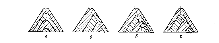 При работе одним резцом схемы резания в зависимости от направления подачи резца относительно оси резьбы можно свести к трем схемам [18]: профильной (рис. 12, а), последовательной (рис. 12, б) и профильно-последовательной (рис. 12, в).