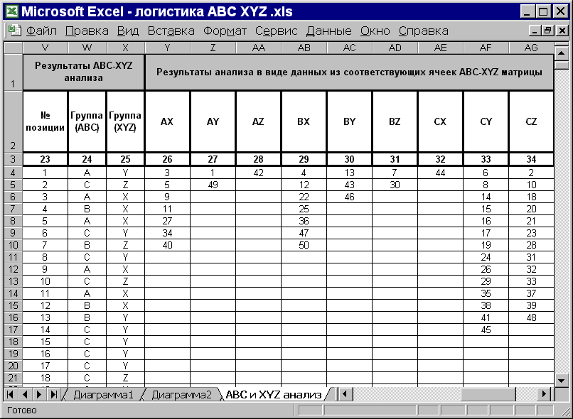 Строки этой таблицы соответствуют группам А, В и С , а столбцы – X, Y и Z соответственно. При этом в ячейку таблицы, соответствующей фиксированной строке и столбцу записываются все номера позиций ассортимента, которые принадлежат соответствующим группам, на которые разбиты все элементы в результате АВС и XYZ – анализа. Таким образом, например, в первую строку и первый столбец записываются все элементы, которые принадлежат одновременно и группе А и группе X. Кстати, элементы именно этой ячейки таблицы заслуживают наибольшего внимания менеджеров.