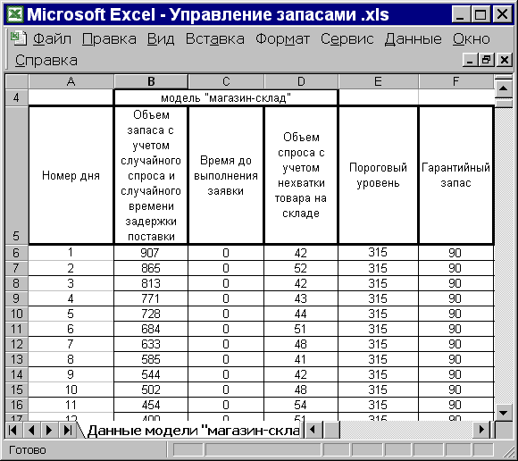Отметим, что данные, приведенные в табл.1. можно использовать для исследования не только стохастических моделей, но и моделей, у которых все входные параметры являются постоянными величинами. Для этого ячейки, содержащие значения стандартных отклонений случайных величин заполняются нулями. При этом ячейки D2 и C2 содержат значения ежедневного спроса и времени поставки дополнительной партии товара.