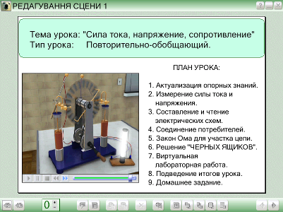 Крім того, на екрані (замість дошки) за допомогою редактору “Microsoft PowerPoint” послідовно відображується план уроку та основні його етапи. На певному етапі проведення уроку вчитель демонструє таблицю варіантів для розв’язання задач «Чорна скринька», а після завершення контролю знань демонструє у режимі відео – мультиплікації послідовність розв’язання усіх варіантів задач, їх правильні відповіді та необхідні електричні схеми.