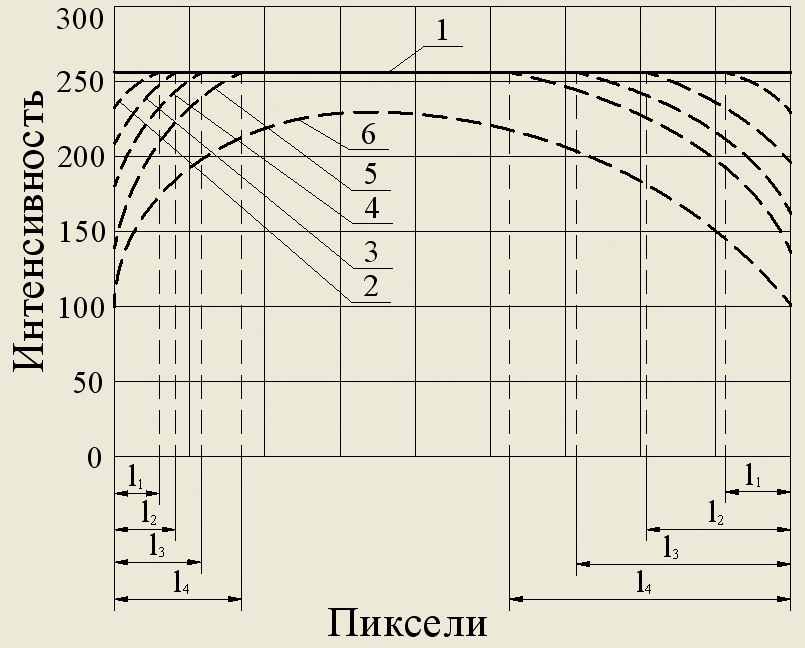 ервая методика основана на построении для оцифрованных изображений ПИ и ОРК. Для устранения влияния границ между волокнами мышечной ткани на ОРК, ПИ исходные изображения подвергались гаусс-размытию (радиус размытия 5, 10, 20 и 30 пикселей). На рис. 1 цифрами показаны четыре направления, по которым снимались ПИ. В идеальном случае ПИ имеют вид, представленный на рисунке 1, г: 1 – исходный, 2–4 – для различного времени посола t, (t1 < t2< t3 и l1< l2< l3), где l – глубина посола. Увеличение времени посола приводит к изменению контраста и ПИ. Сопоставляя изображения ОРК с ПИ, и зная размеры образца мяса, можно надёжно оценить глубину проникновения смеси и каждого её компонента в отдельности.