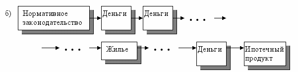 Ипотечные продукты могут быть классифицированы по признаку организации отношений между участниками ипотечной системы (то есть по сложности цикла ипотечного процесса) как примитивные, классические и высокие финансовые технологии. Жизненные циклы ипотечных процессов, результатами которых являются “примитивные” и “классические” ипотечные продукты, а также “высокие финансовые технологии” можно представить в следующем виде (рис.3).