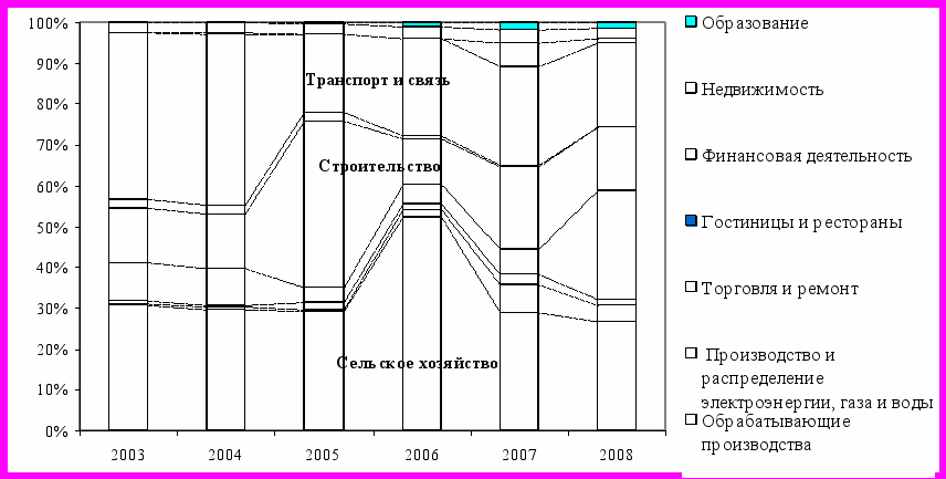 В 2005г. порядка 40% перемещено в сферу строительства при сохранении практически неизменной доли в распределении инвестиций со стороны сельского хозяйства. За последние два года распределение инвестиционных ресурсов осуществлялось относительно равномерно, в 2008 г. отмечалось повышение активности в сфере производства и распределения электроэнергии, газа и воды, т.е. в инфраструктурных, поддерживающих видах производств.