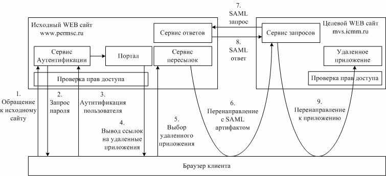 На первом этапе пользователь проходит аутентификацию на исходном сайте – портале ПНЦ c.ru. После успешного завершения аутентификации, пользователю выдается список ссылок на приложения, доступ к которым ему разрешен. Пользователь выбирает интересующее его приложение, например, сайт вычислительного кластера МВС-1000 ru. Кластер установлен в Институте Механики Сплошных Сред УрО РАН (ИМСС), входящем в ПНЦ. Таким образом, сайты находятся как в разных административных, так и в разных DNS доменах. Для организации однократной регистрации между доменами установлены доверительные отношения: ИМСС как проверяющая сторона доверяет ПНЦ как авторитетной инстанции и наоборот. После того, как пользователь на сайте ПНЦ выбрал ссылку на сайт вычислительного кластера ИМСС, происходит перенаправление HTTP запроса на сайт кластера. При этом к запросу добавляется SAML артефакт со ссылкой на утверждения о пользователе. Сайт вычислительного кластера получив SAML артефакт, формирует запрос к сайту ПНЦ для получения информации о пользователе и его правах. После получения нужной информации пользователь получает доступ к сайту, если это разрешает политика безопасности сайта вычислительного кластера.