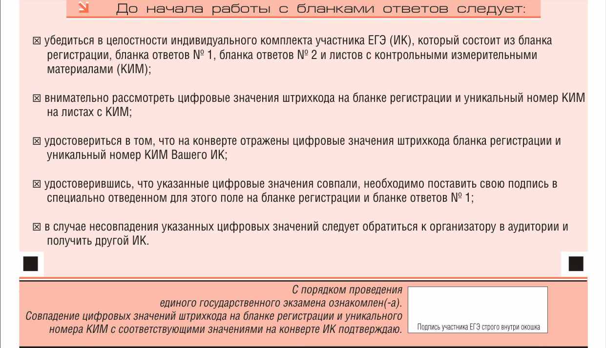 После окончания заполнения бланка регистрации и выполнения всех пунктов краткой инструкции по определению целостности индивидуального комплекта участника ЕГЭ («До начала работы с бланками ответов следует:») участник ЕГЭ ставит свою подпись в специально отведенном для этого поле.