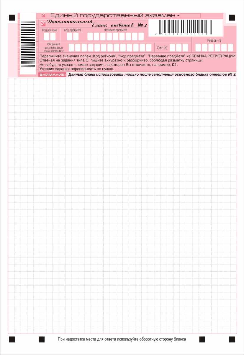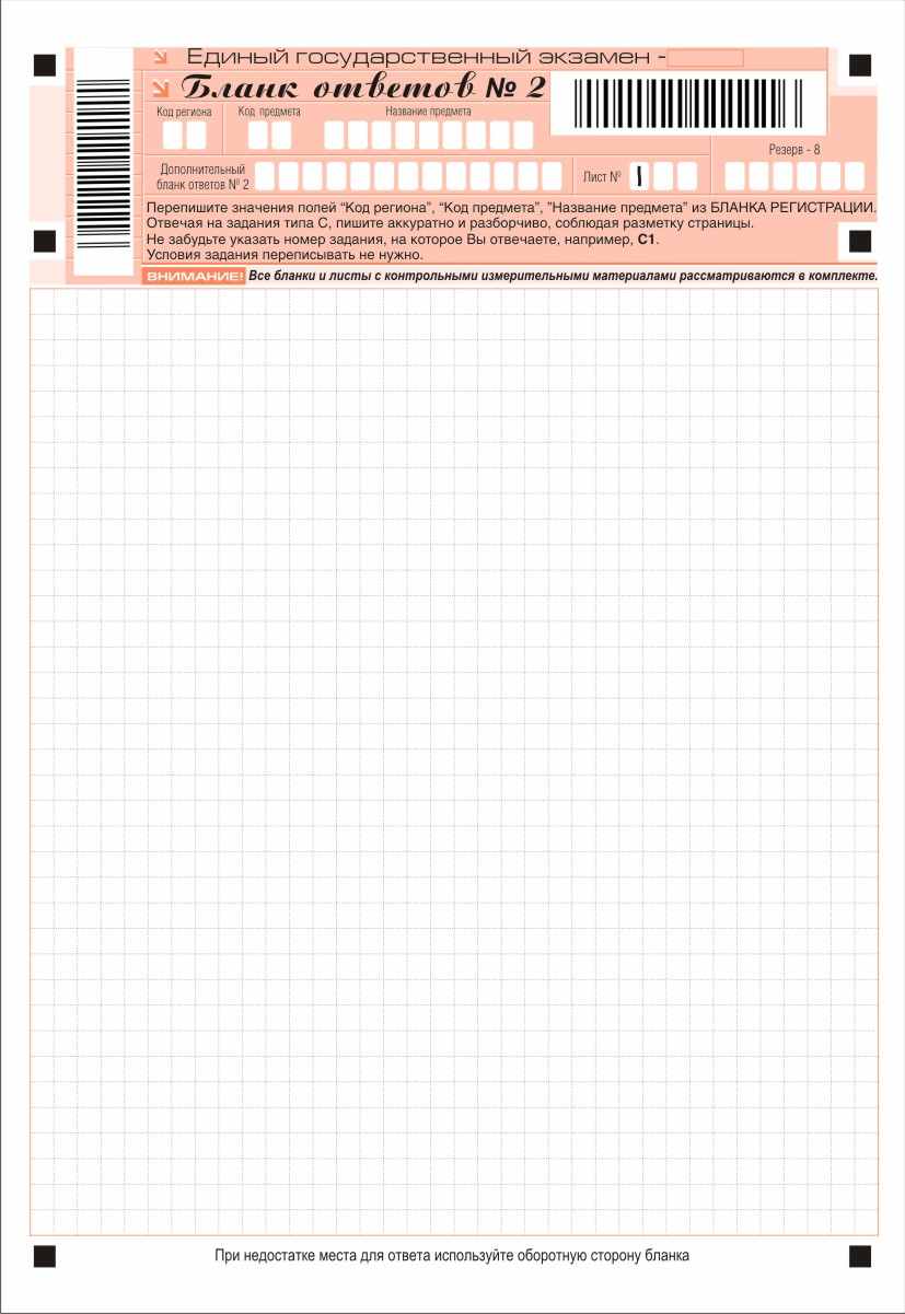 При недостатке места для ответов на основном бланке ответов № 2 участник ЕГЭ может продолжить записи на дополнительном бланке ответов № 2, выдаваемом организатором в аудитории по требованию участника в случае, когда на основном бланке ответов № 2 не осталось места. В случае заполнения дополнительного бланка ответов № 2 при незаполненном основном бланке ответов № 2, ответы, внесенные в дополнительный бланк ответов № 2, оцениваться не будут.