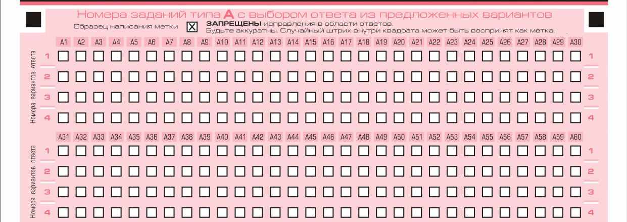 При заполнении области ответов на задания типа А следует строго соблюдать инструкции по выполнению работы (к группе заданий, отдельным заданиям), приведенные в КИМ. В столбце, соответствующем номеру задания в области ответов на задания типа А, следует делать не более одной метки. При наличии нескольких меток такое задание заведомо будет считаться неверно выполненным.