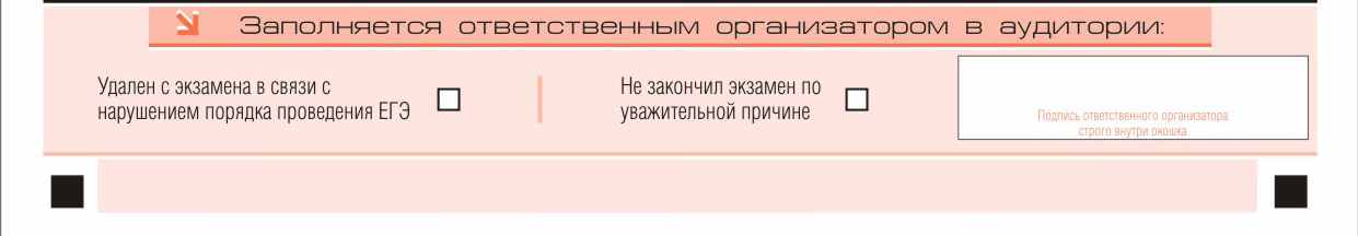 В нижней части бланка регистрации расположена область для отметок организатора в аудитории о фактах удаления участника ЕГЭ с экзамена в связи с нарушением порядка проведения ЕГЭ, а также о том, что участник не закончил экзамен по уважительной причине (рис. 5).