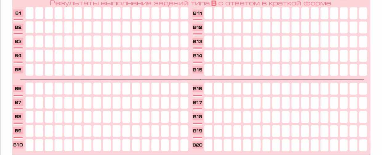 Краткий ответ можно давать только в виде слова, одного целого числа или комбинации букв и цифр, если в инструкции по выполнению работы не указано, что ответ можно дать с использованием запятых для записи ответа в виде десятичной дроби или в виде перечисления требуемых в задании пунктов. Каждая цифра, буква, запятая или знак минус (если число отрицательное) записывается в отдельную клеточку, строго по образцу из верхней части бланка. Не разрешается использовать при записи ответа на задания типа В никаких иных символов, кроме символов кириллицы, латиницы, арабских цифр, запятой и знака дефис (минус).