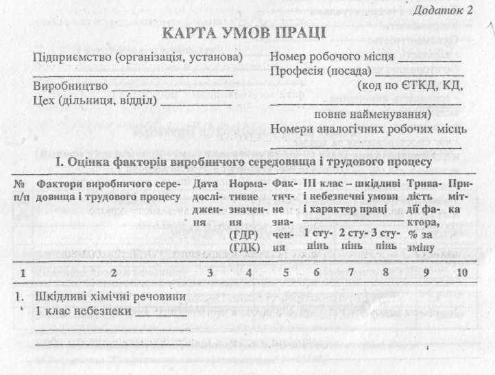 1. Санітарно-гігієнічна характеристика умов праці тієї категорії працівників, щодо яких ставиться питання, з урахуванням атестації робочих місць, вона повинна мати такі дані:
