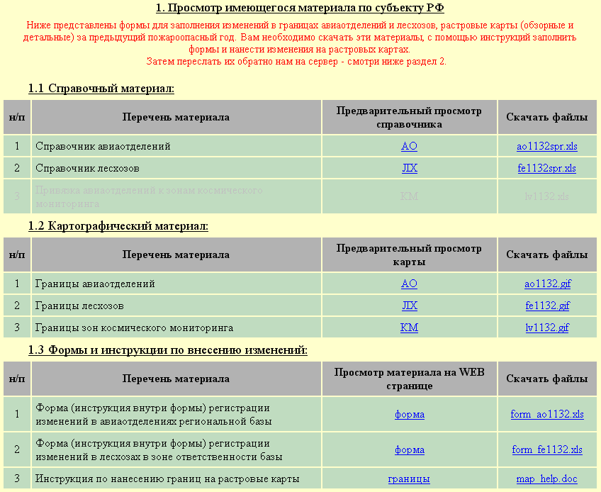 1. Просмотр материалов по состоянию данных о границах территориального деления лесного фонда субъекта за прошедший пожароопасный сезон (ПС) осуществляется на созданных и размещенных на сервере ИСДМ-Москва Web-интерфейсах (рис. 3а). Материалы включают справочники лесхозов и авиаподразделений; растровые карты границ ТД, созданные в рамках первого базового блока; формы регистрации, содержащие обобщенные и классифицированные по типам изменения.
