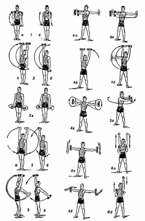 И.П. - стоя у опоры, в одной руке гантель или гиря, другой взяться за опору: концентрические круги отведенной в сторону прямой рукой. Дыхание ритмичное, каждый вдох и выдох - на один - два оборота рукой.