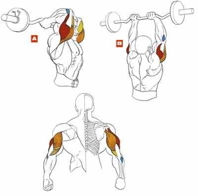 И.П. - стоя, ноги на ширине плеч, штанга на плечах: жим штанги из-за головы хватом от среднего до широкого.
