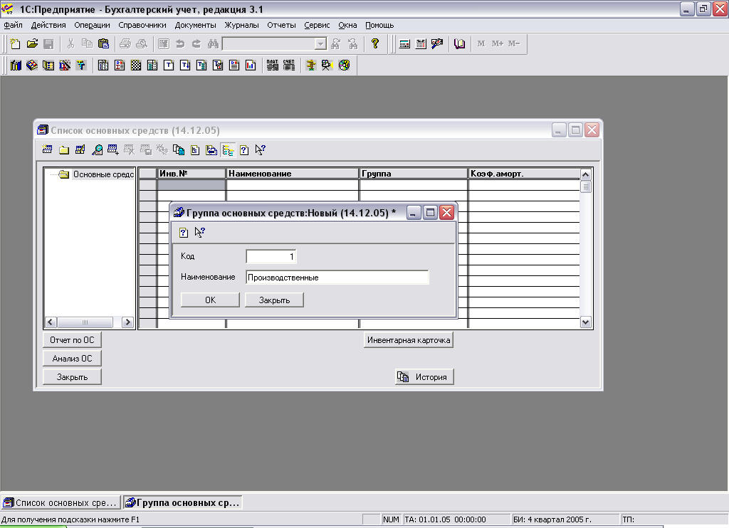 Поскольку справочник является двухуровневым, имеется возможность обеспечения дополнительной группировки основных средств. В качестве групп ОС можно определить типовые классификационные группы, установленные органами Госстатистики: здания, сооружениям, передаточные устройства, машины и оборудование и т.п.