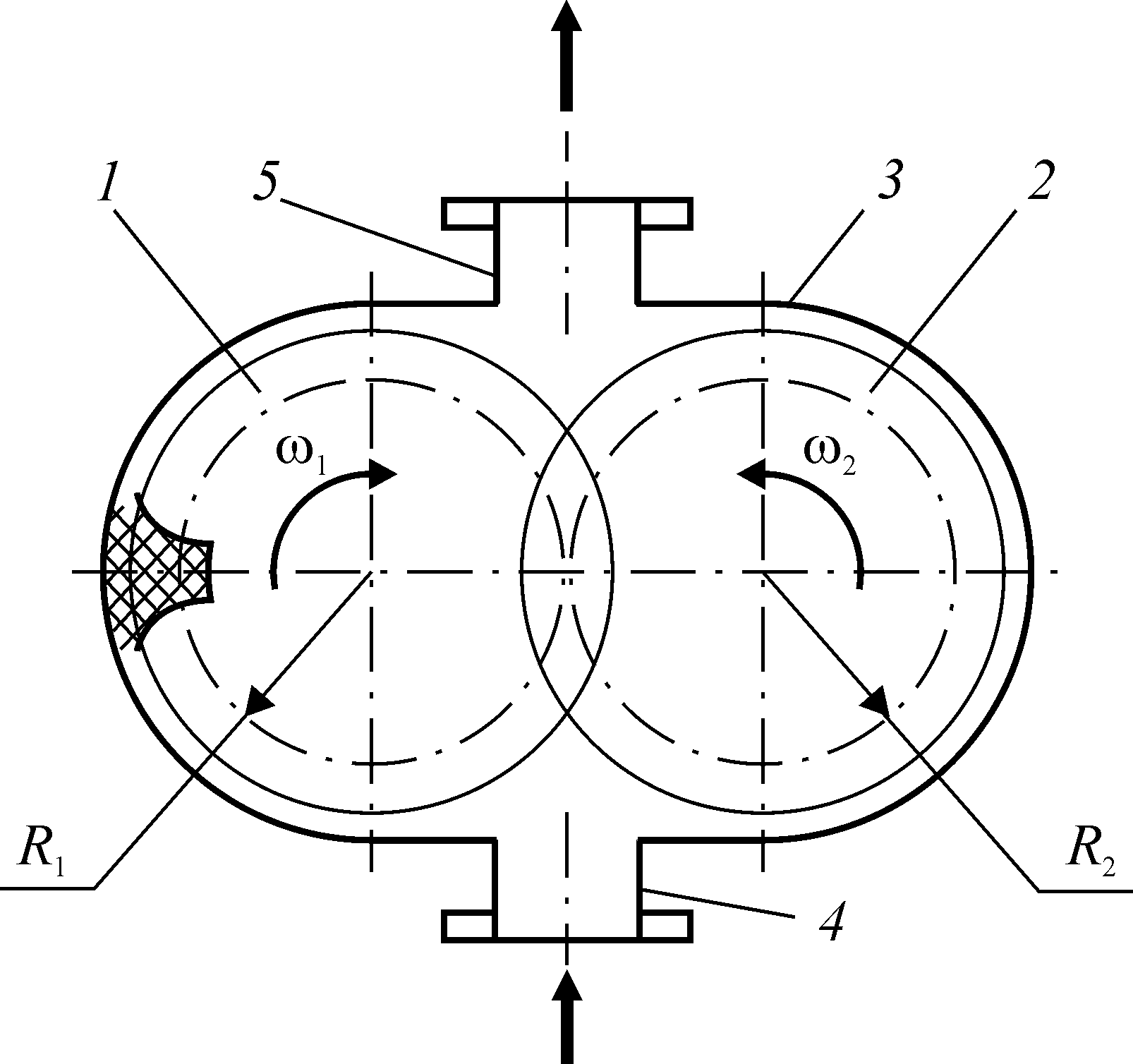 Ведущее 1 и ведомое 2 зубчатые колеса с минимальными зазорами (как по торцевым, так и по цилиндрическим поверхностям) вращаются в корпусе 3 в направлениях, показанных стрелками. Жидкость, поступающая через всасывающий патрубок 4, попадает во впадины зубчатых колес (область, выделенная штриховкой). Каждый из таких объемов жидкости во впадине переносится колесом вдоль наружной стороны корпуса к нагнетательному патрубку 5, где и выдавливается из впадины зубом другого колеса.