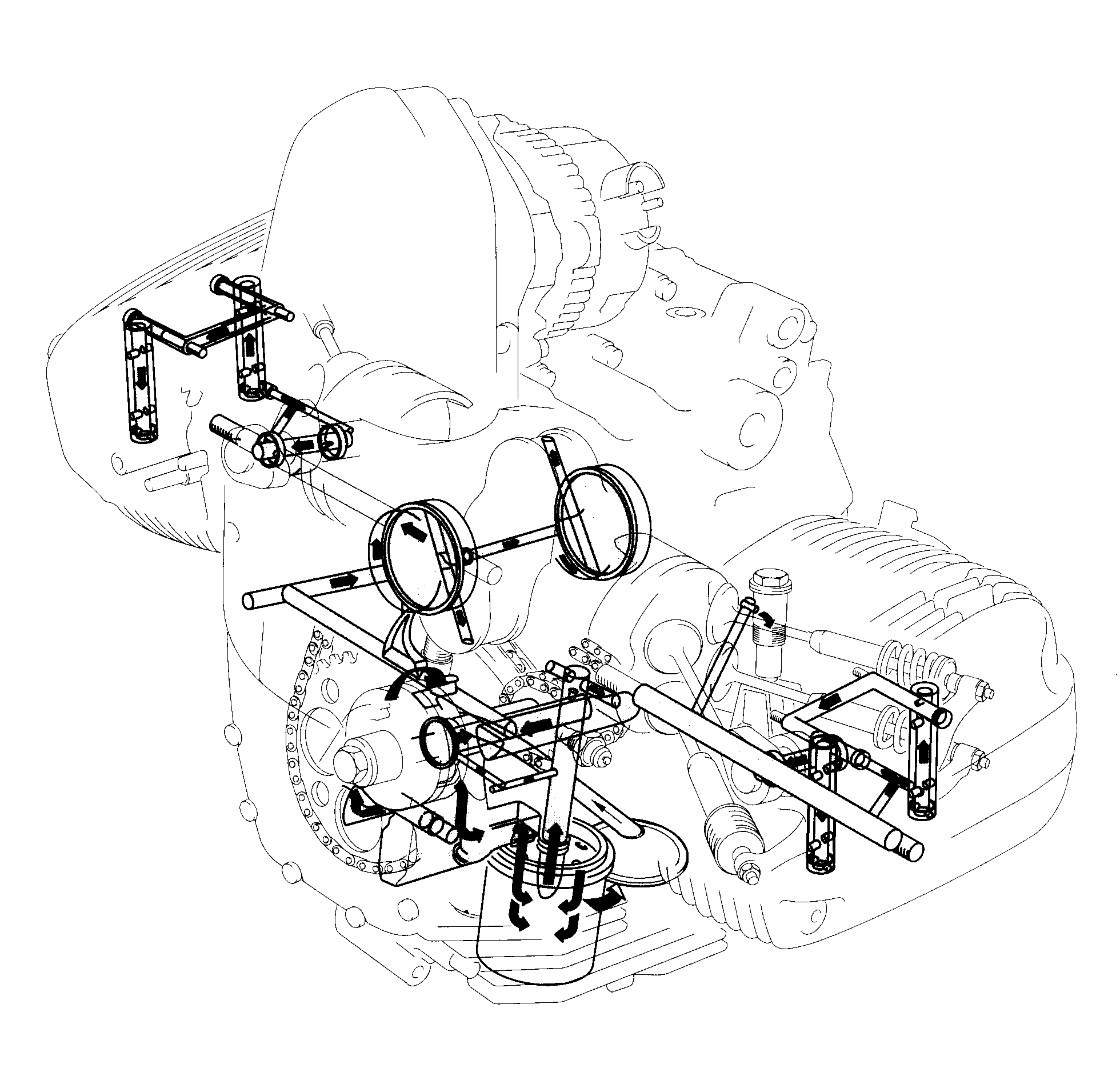 Закрепить приспособление BMW Nr.110630 на картере двигателя. Двигатель переставить на сборочный стеллаж.