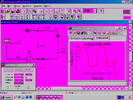 Каждый элемент имеет точки соединения, которые нужно соединить для получения нужной схемы. Это делается выбором контакта левой кнопкой мыши и переносом ее к другому контакту, при этом создается провод, соединяющий их. При необходимости на провод можно нанести узел (Connector в наборе Basics). Затем для наглядности можно перенести элементы в необходимые места рабочей области. Это действие также осуществляется нажатием на элементе левой кнопкой мыши и переносом при удержанной в нажатом состоянии кнопке. При этом соединительные провода будут перемещены автоматически. При необходимости провода можно также перемещать. На рис.1 представлен вид интерфейса Electronics Workbench после сборки цепи диодного ограничителя.